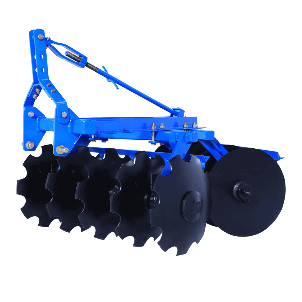 A mounted offset disc harrow is designed to prepare soil for planting by breaking up the ground and incorporating crop residues or weeds. Unlike parallel disc arrangements, the offset configuration ensures that the discs cut through the soil repeatedly, enhancing the tilling effect. The concave shape and angled offset of the discs work together to loosen and lift the soil, improving soil preparation efficiency.
